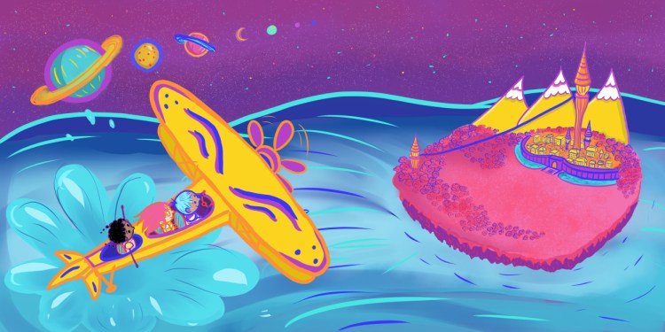 Some double spreads from a story about a child meeting her characters and the world she created. Based on a story I wrote when I was a kid.