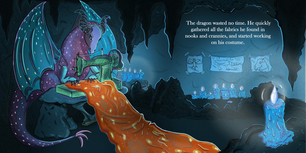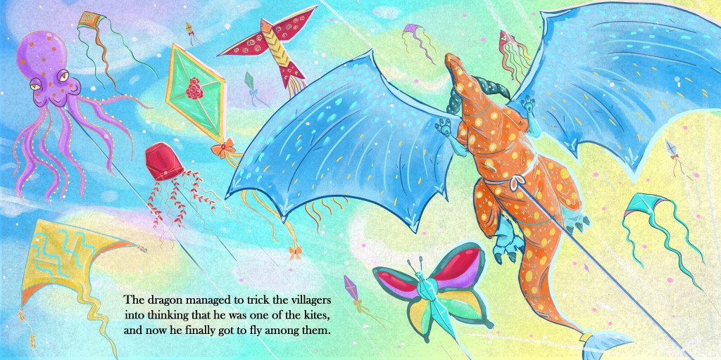 Two double spreads from a story about a dragon wanting to join a kite festival.