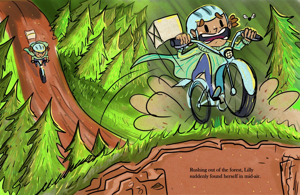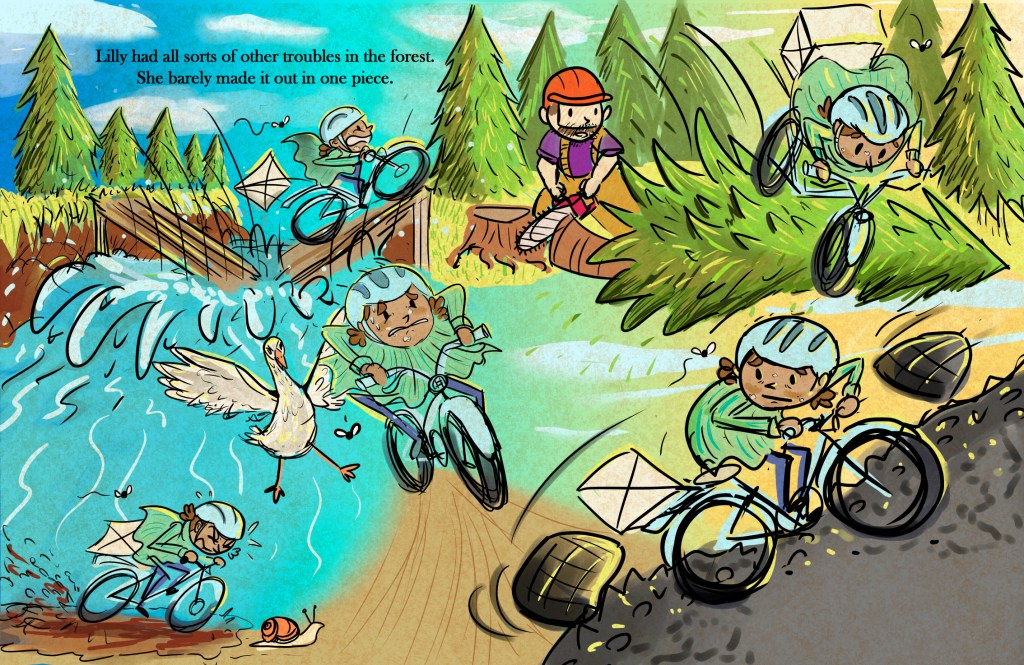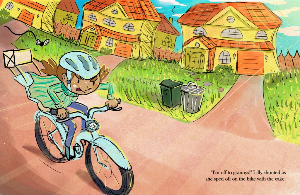 Some double spreads from Lilly’s Adventure, a story about a child trying to bike to her Grannys without messing up the cake she baked for her.