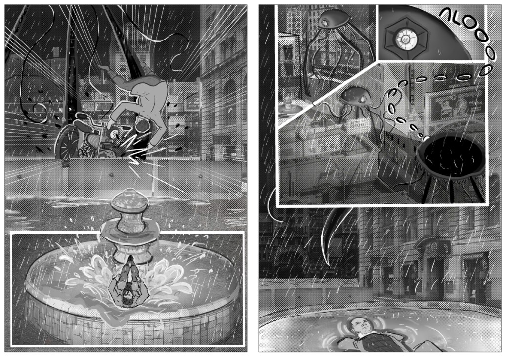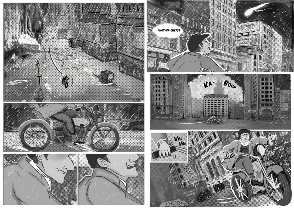 This is a short comic adaptation of one of the scenes from the book War of the Worlds by H.G Wells. Where the protagonist sees the Martians Tripods for the first time. The setting is in America in the 1920s, instead of London in the 1890s.
